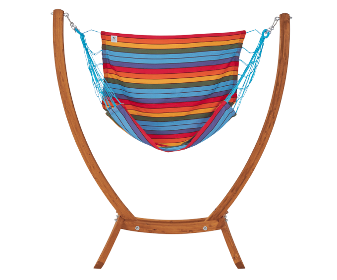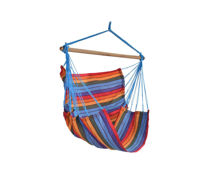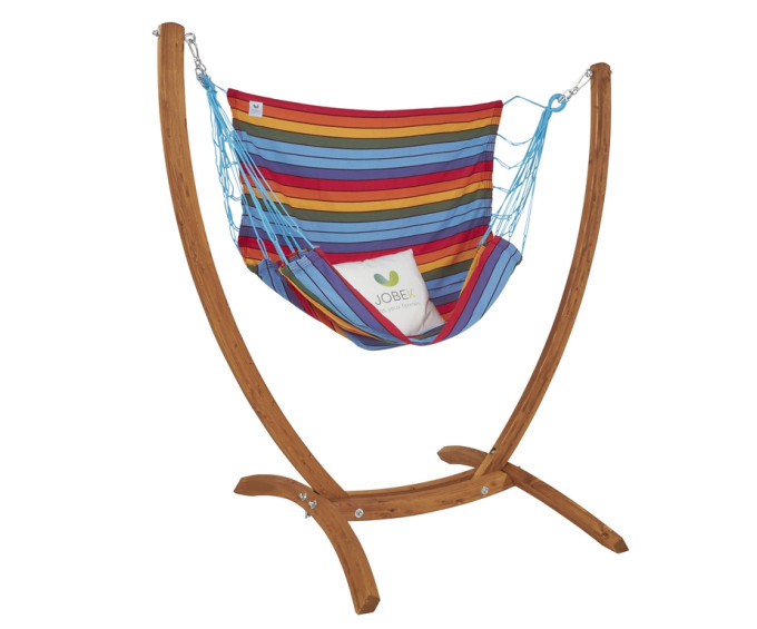 Il est accompagné d'une chaise à pendre Trankil fabriquée au Brésil en Jobekcord avec une barre bois de 110cm amovible, afin de conserver une chaise adaptable sur tous supports selon vos envies.