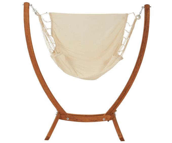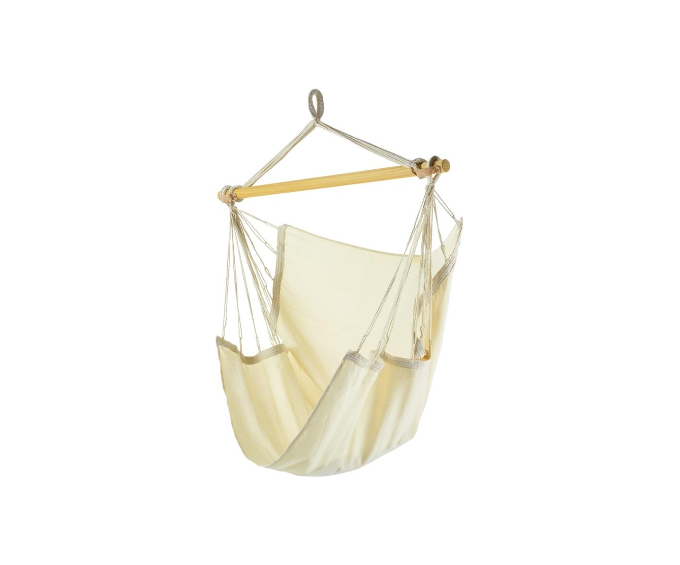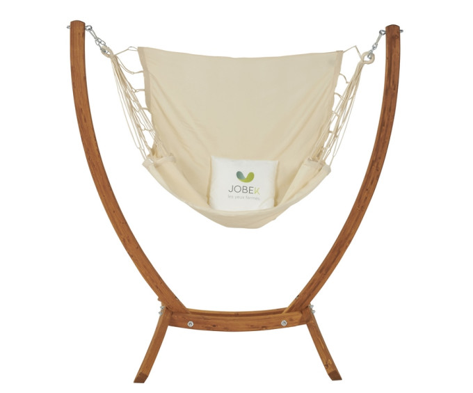 Il est accompagné d'une chaise à pendre Trankil fabriquée au Brésil en Jobekcord avec une barre bois de 110cm amovible, afin de conserver une chaise adaptable sur tous supports selon vos envies.